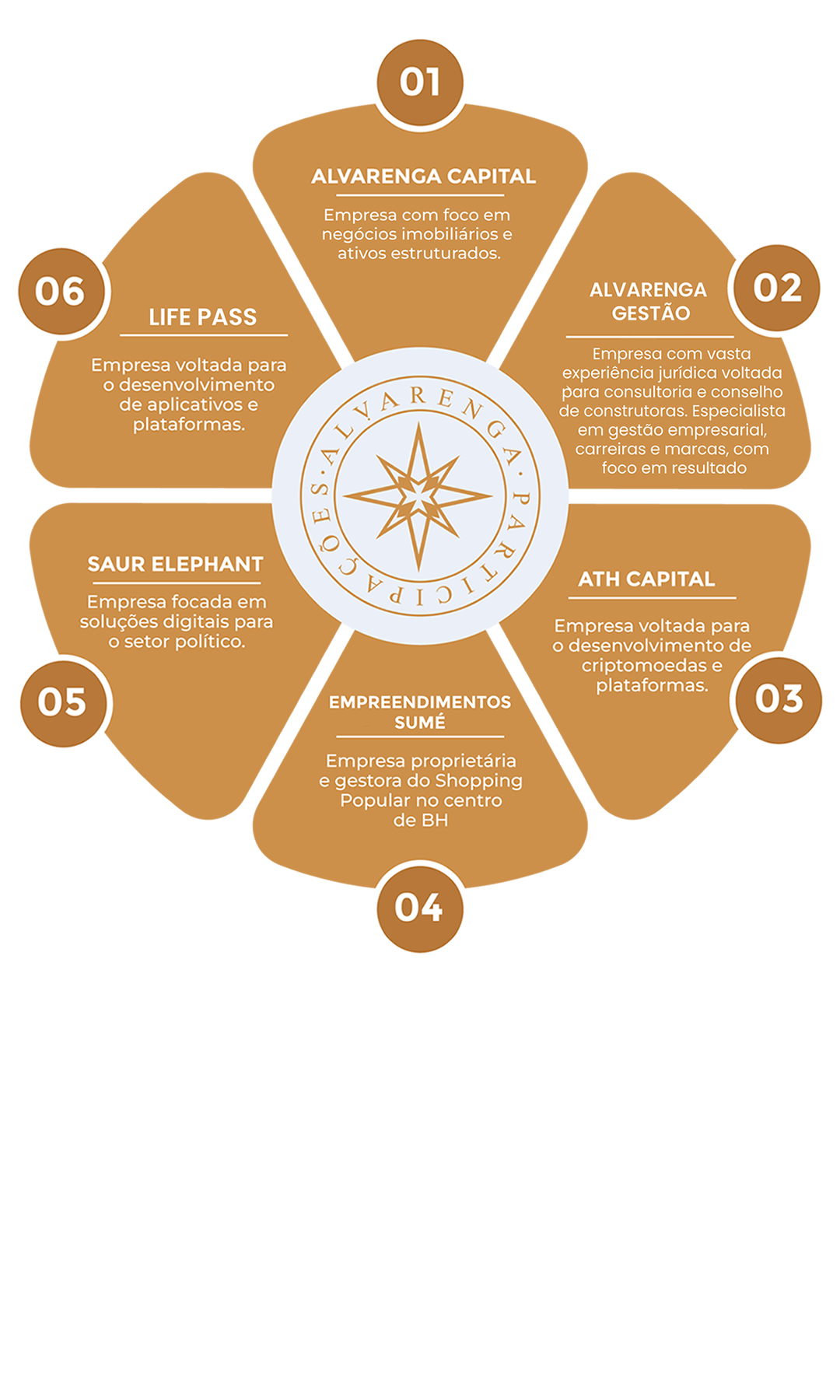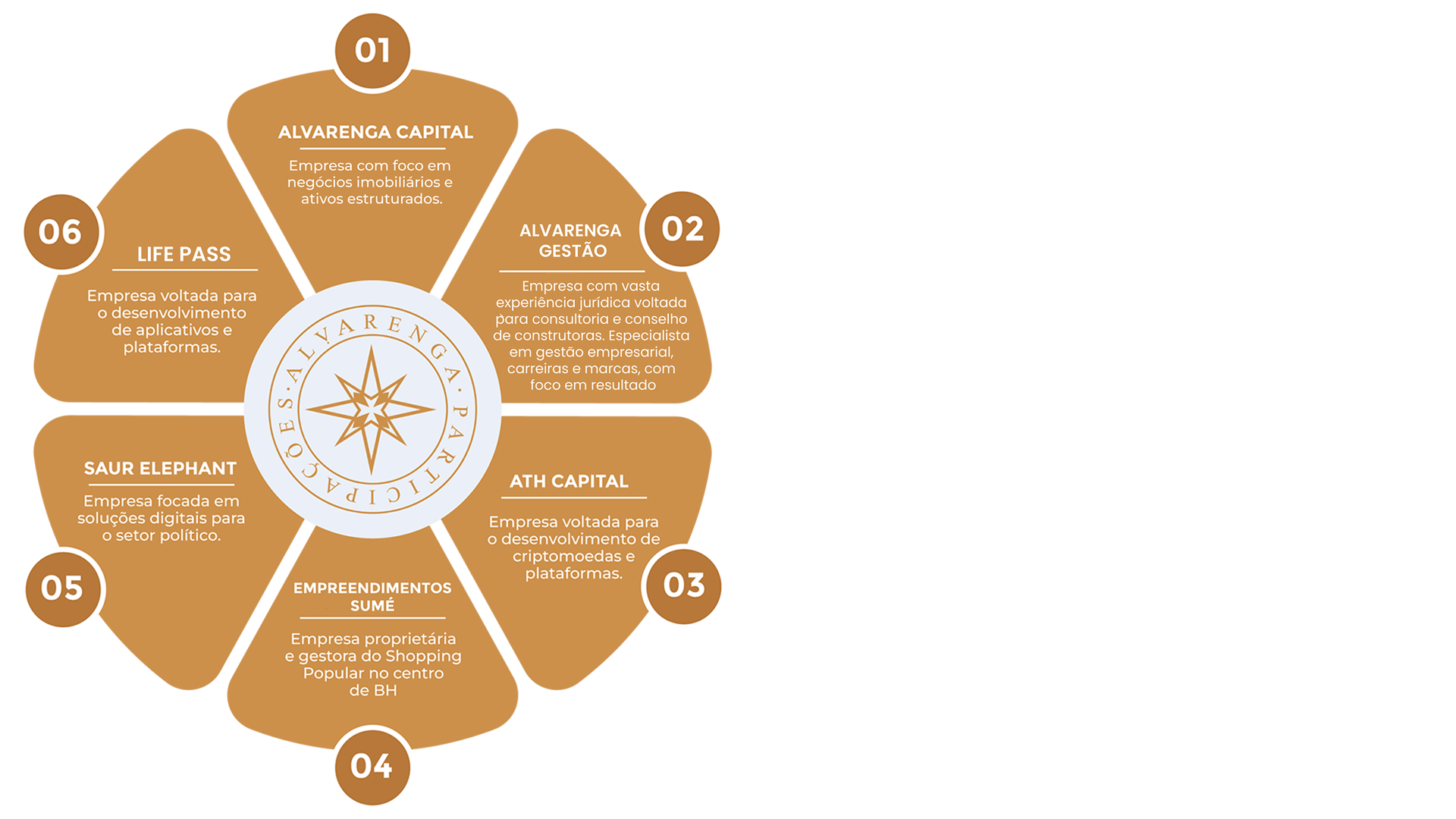 Fundada por Filipe Alvarenga a ALVARENGA PARTICIPAÇÕES é uma evolução empresarial da história profissional de seu CEO que, através de seus pilares (TRANSPARÊNCIA | SOLIDEZ | CONFIDENCIALIDADE | PROSPERIDADE ÉTICA) busca retratar a experiência de mais de 14 anos atuando no mercado imobiliário com investidores, onde foram gerados e faturados milhões em negócios. Alvarenga Participações é uma Holding patrimonial e empresarial composta por um conglomerado de empresas que fazem comunicação entrei si com objetivo de maximizar o crescimento do grupo, que conta hoje com uma empresa de desenvolvimento imobiliário, empresa de Publicidade e Comunicação, uma gestora de investimento em criptoativos, uma desenvolvedora de tecnologia através de aplicativos e um shopping popular, entre outras. A Alvarenga Participações preza pelo melhor rendimento financeiro de seus parceiros e investidores. Não existe investimento sem risco e nosso fundamento é mapear muito bem os riscos a serem corridos, tomando uma decisão extremamente racional e coerente com o desejo dos investidores envolvidos, acoplados aos pilares da empresa.